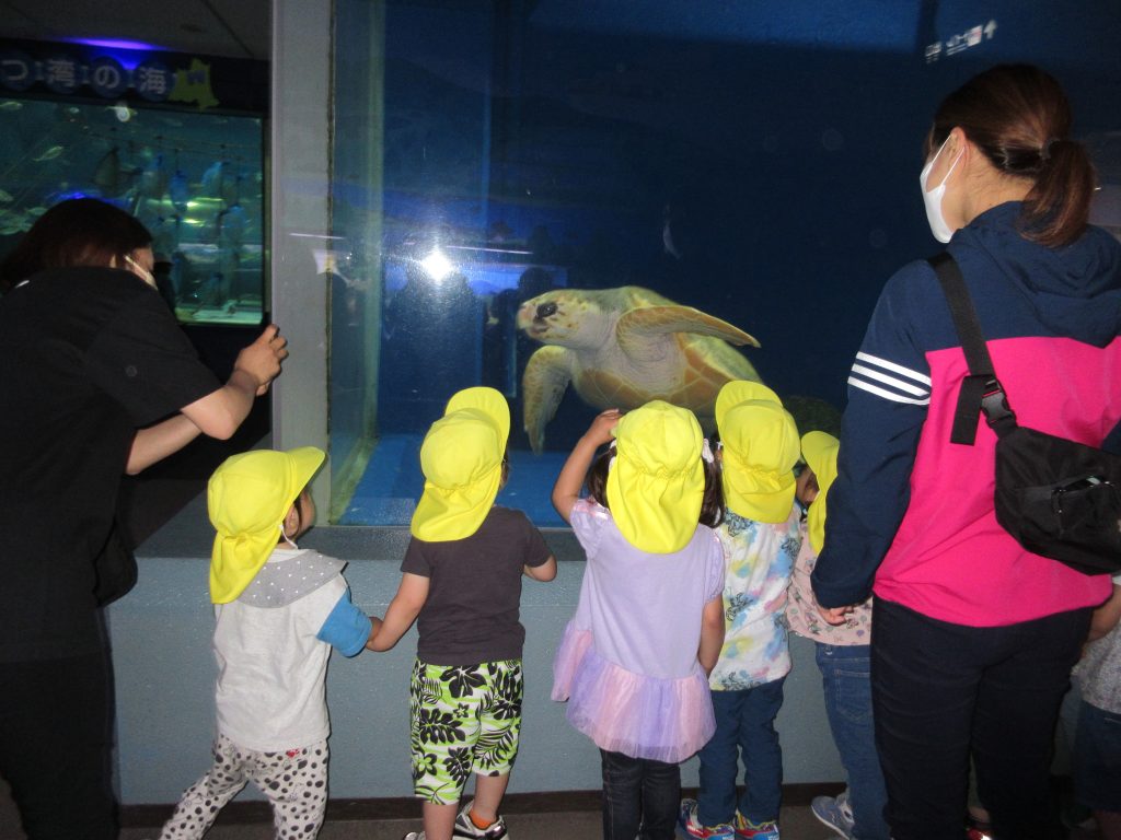 入り口で大きなカメさんにお出迎えされ、たくさんの海の生き物を見学し、