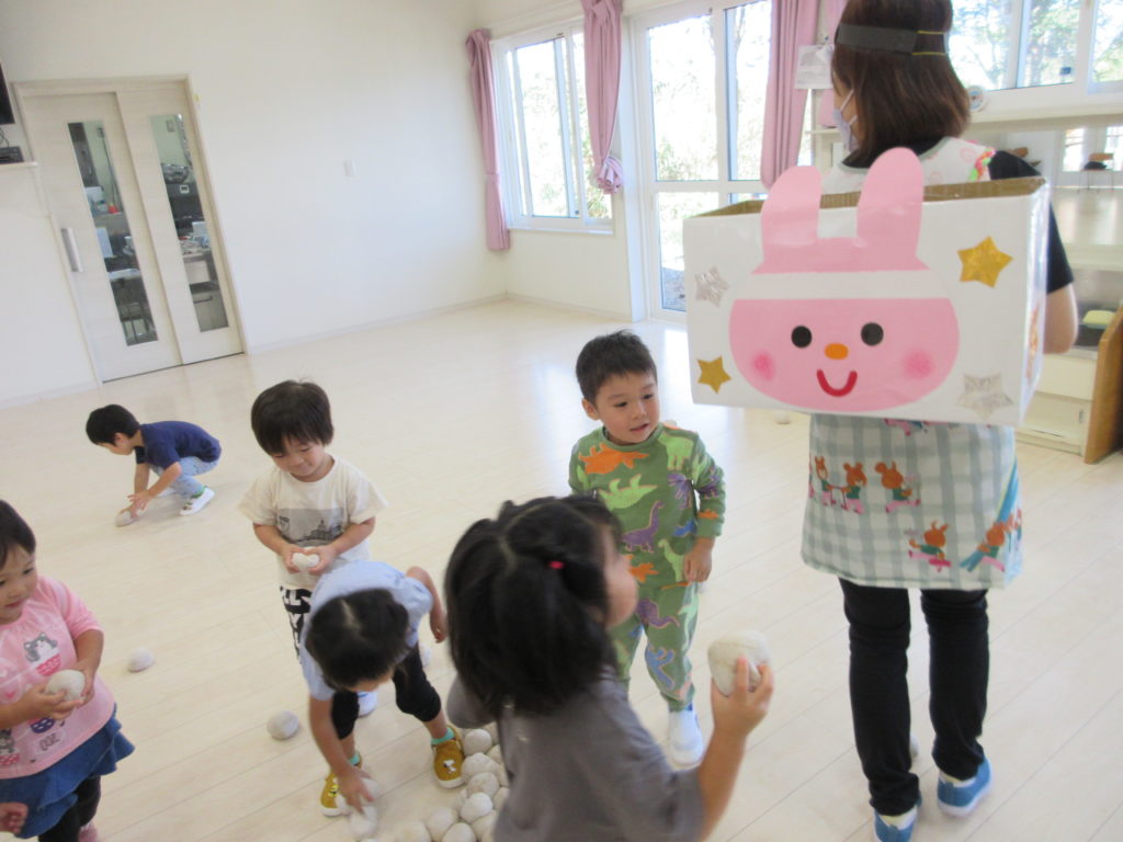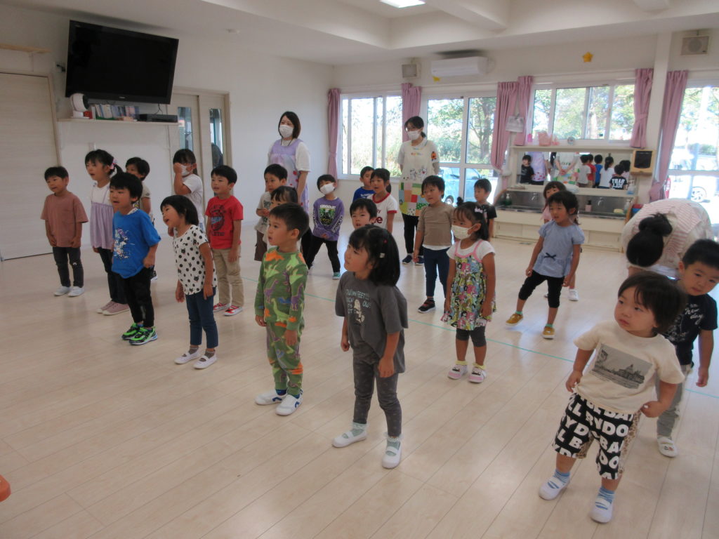 お遊戯室に全園児さんが集合して十五夜集会を開きました(*^-^*)