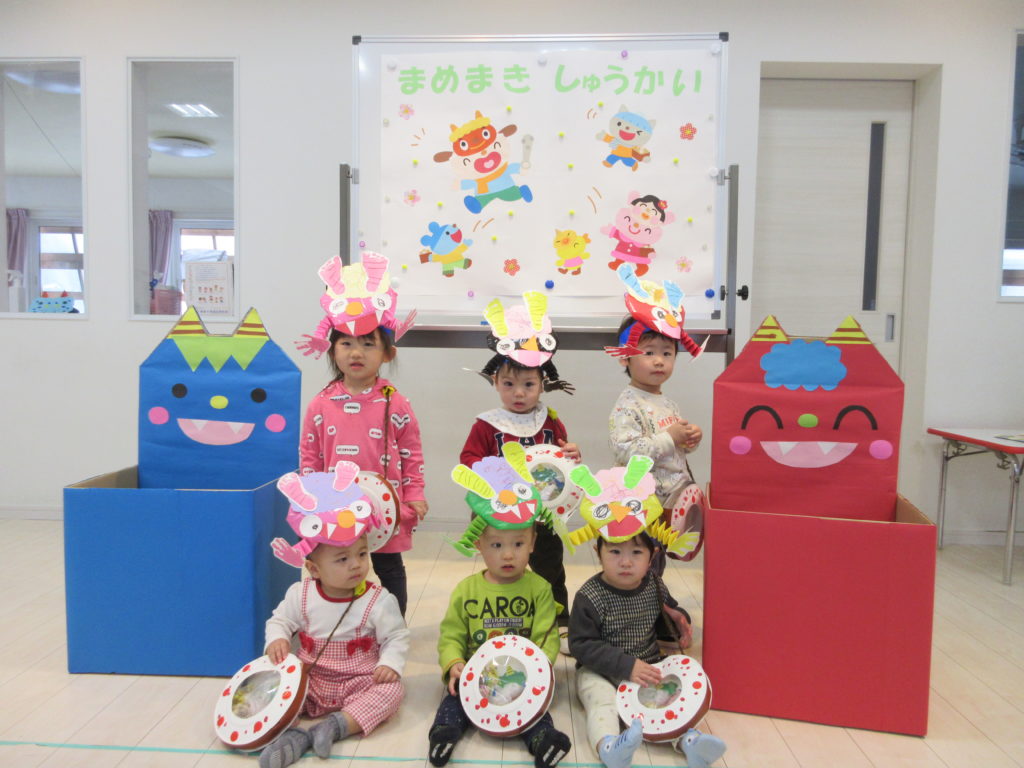 子供たちは、全員お遊戯室に集まり、一足早く豆まき集会を楽しみました。