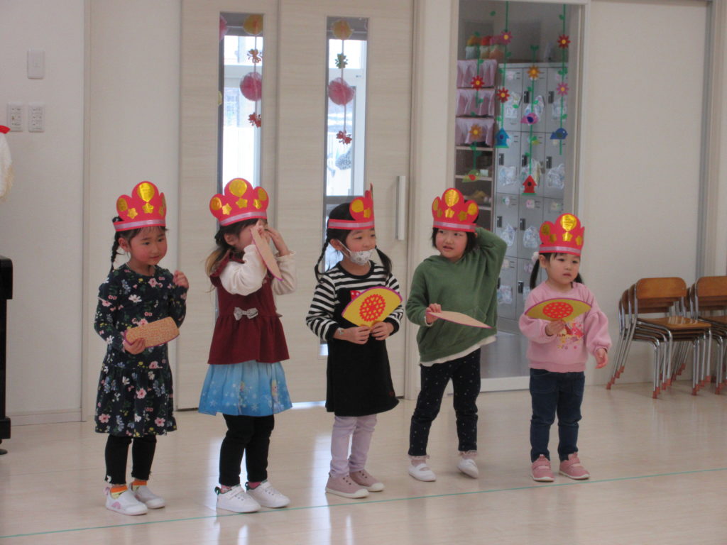 最後に、おひなさまとおだいりさまに変身した子どもたちは、🎵うれしいひなまつり🎵のお歌を元気にうたって、ひなまつりの気分を味わいました💗