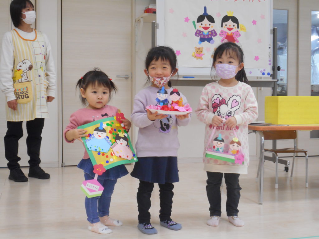 自分で作ったおひな様を披露したり、お歌を歌ったり、紙芝居を見たり、色々な催し物で楽しみました~❕❕\(^_^)/